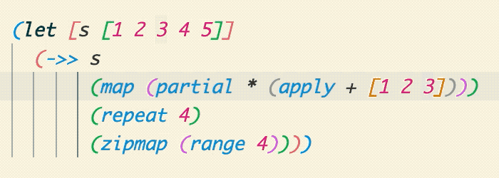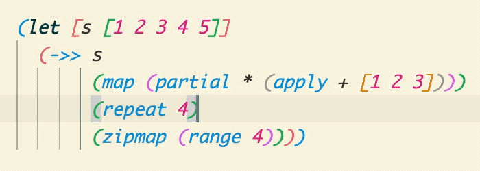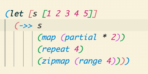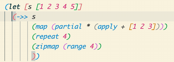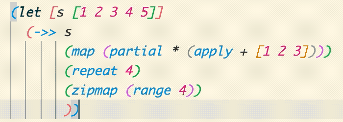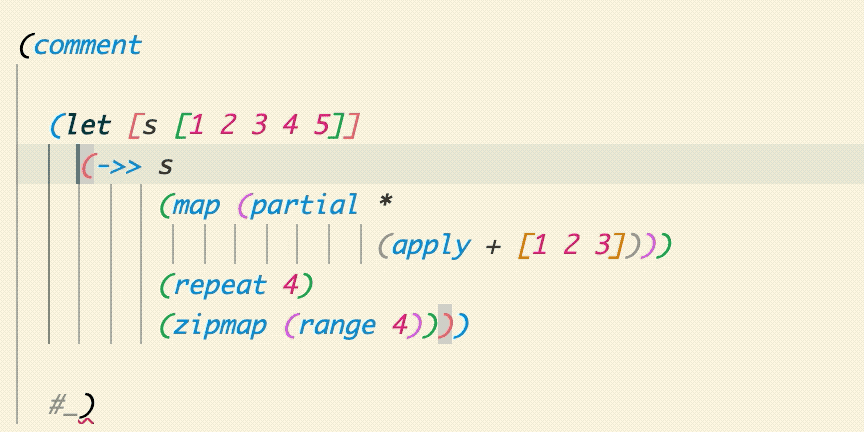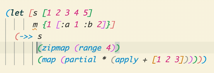 When dragging forms inside maps and binding boxes, such as with let, for, binding, etcetera, it often makes most sense to drag each binding as a pair. And this is what Calva will do. Like so: